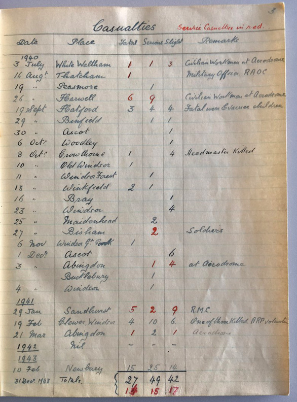 The incident report below contains summaries of bombing raids and alerts across Berkshire, which include statistical data on casualties, damage to buildings and unexploded bombs.