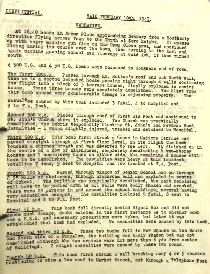 Berkshire County Council bombing raids and alerts incident report, list of casualties, 1940-1943, C/CD/C2. This includes the casualties in the Newbury bombing raid on 10 February 1943