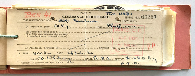 Unexploded Bomb Clearance Certificate for Priors Meadow, Bray, 1944, C/CD/C5