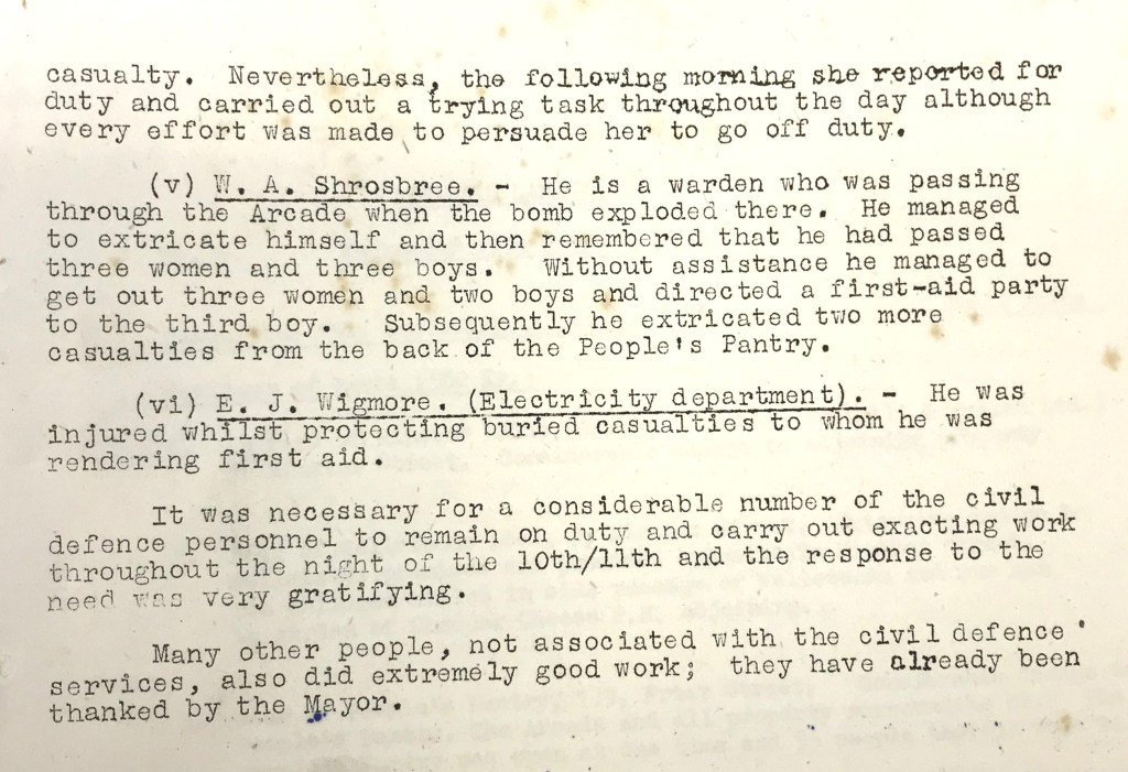 The report records commendations for the bravery shown by wardens and civilians. The Women’s Voluntary Service provided refreshments to survivors and rescue workers in the aftermath of the attack.