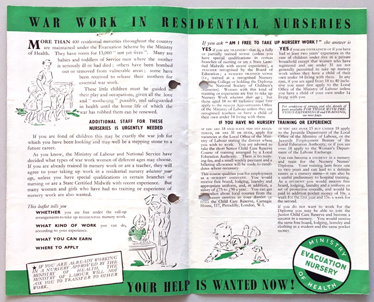 Local authorities were expected to plan accommodation and schooling for everyone they received. Wartime nurseries were set up to provide childcare for babies and toddlers of women employed in essential war work and other vulnerable children. This circular, dated April 1944, is an urgent appeal by the Ministry of Health for additional staff.