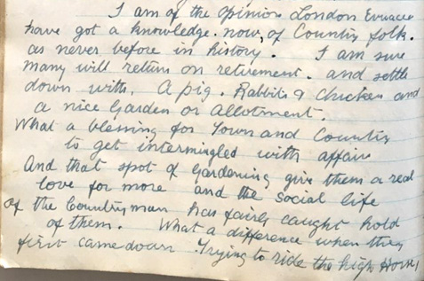“…I am of the opinion London Evacuees have got a knowledge, now, of Country folk, as never before in history. I am sure many will return on retirement, and settle down with, a pig, rabbits & chicken and a nice garden or allotment. What a blessing for Town and Country to get intermingled with affairs and that spot of gardening give them a real love for more and the social life of the Countryman has fairly caught hold of them. What a difference when they first came down…”