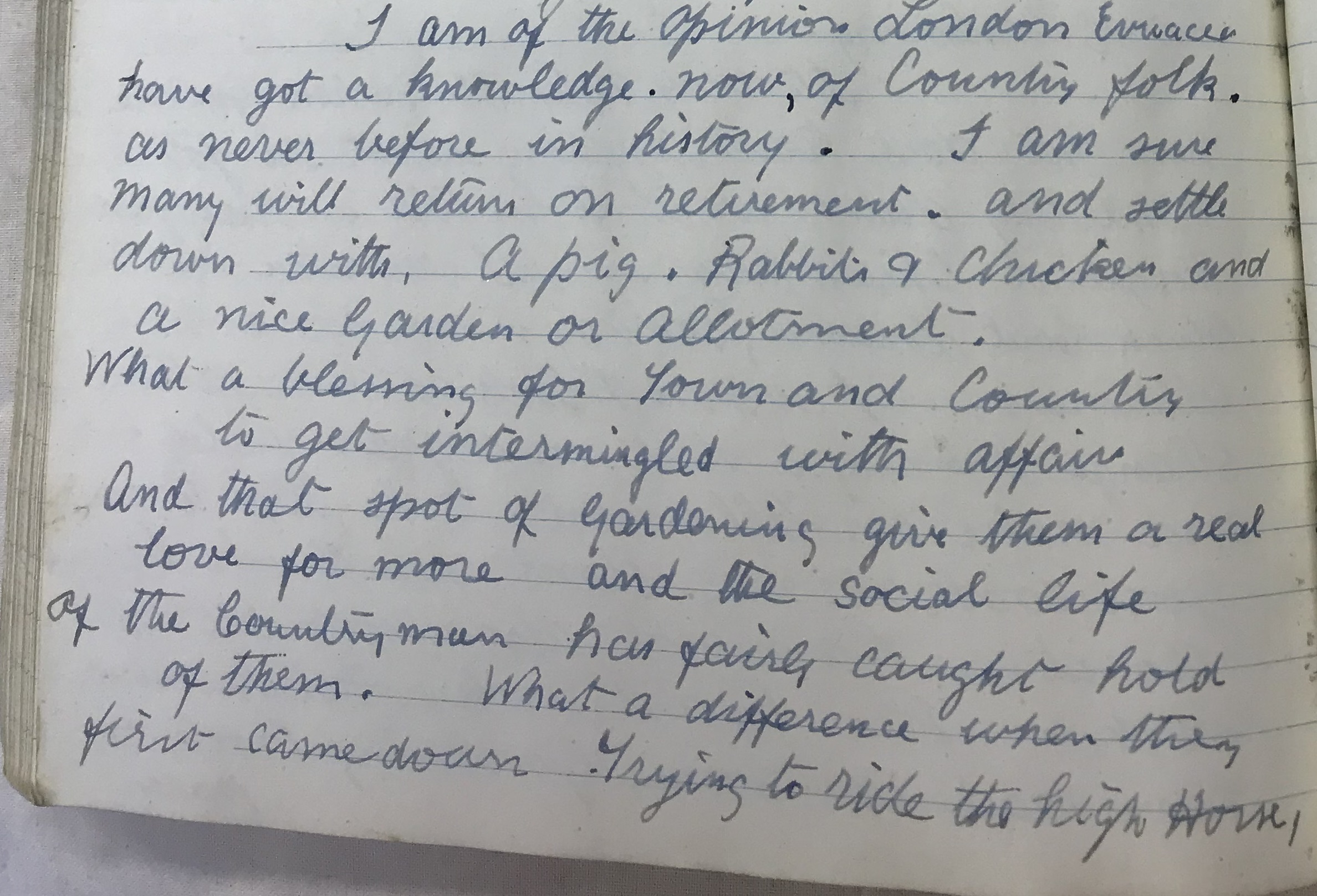 “…I am of the opinion London Evacuees have got a knowledge, now, of Country folk, as never before in history. I am sure many will return on retirement, and settle down with, a pig, rabbits & chicken and a nice garden or allotment. What a blessing for Town and Country to get intermingled with affairs and that spot of gardening give them a real love for more and the social life of the Countryman has fairly caught hold of them. What a difference when they first came down…”