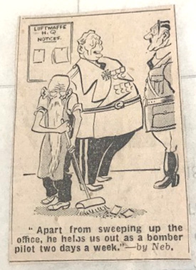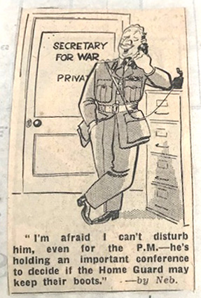This contrasts with the popular perception of the Home Guard as ‘Dad’s Army’, as illustrated by the contemporary newspaper cartoons in the gallery below. They were kept within the papers of the Huntley and Palmers Home Guard Association. The envelope reads: “for lighter moments”.