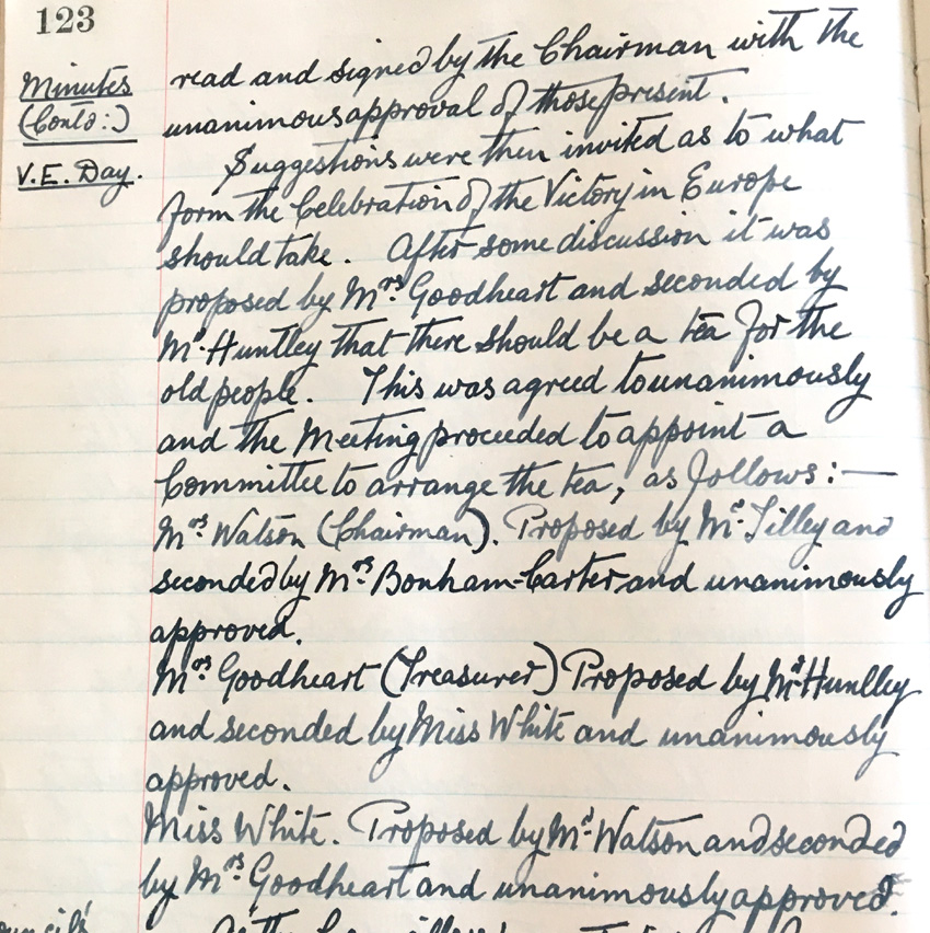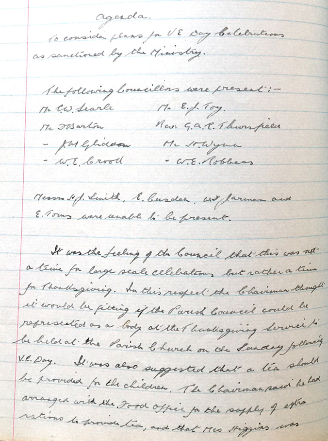 The meeting extracts below are from Inkpen and Sunninghill Parish Councils and contrast the need to celebrate and reflect. While the members in Inkpen unanimously agreed to ‘serve tea for the old people’, Sunninghill council decided that this was ‘not the time for large scale celebrations, but rather a time for thanksgiving.’