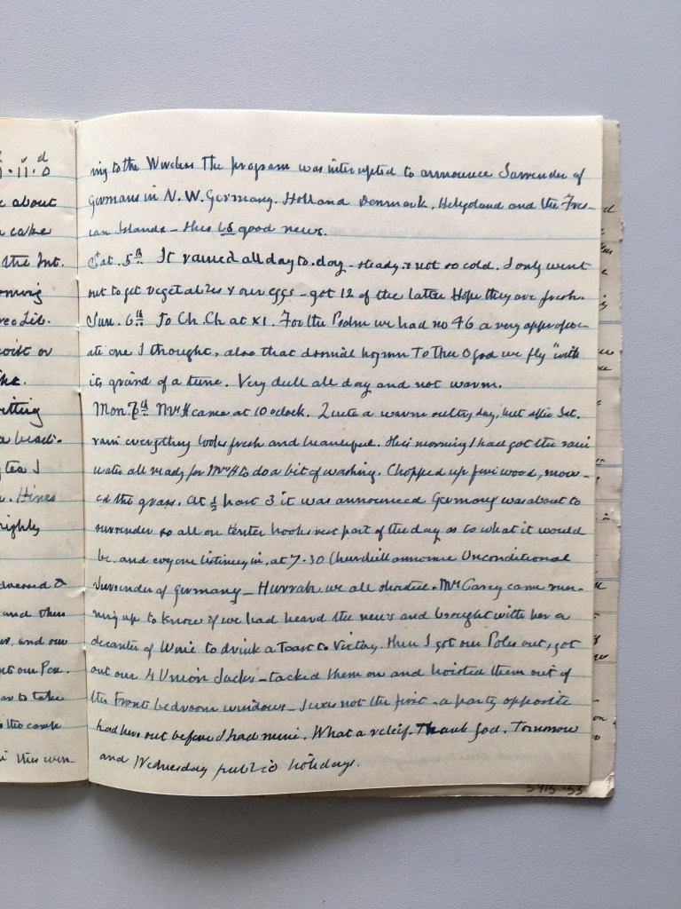 “Mrs Carey came running up where we heard the news and brought with her a decanter of wine to drink a toast to Victory. Then I got our poles out, got out our union jacks – tacked them on and pointed them out of the front bedroom windows. I was not the first – a party opposite had theirs out before I had mine. What a Victory. Thank god. Tomorrow and Wednesday public holidays.”